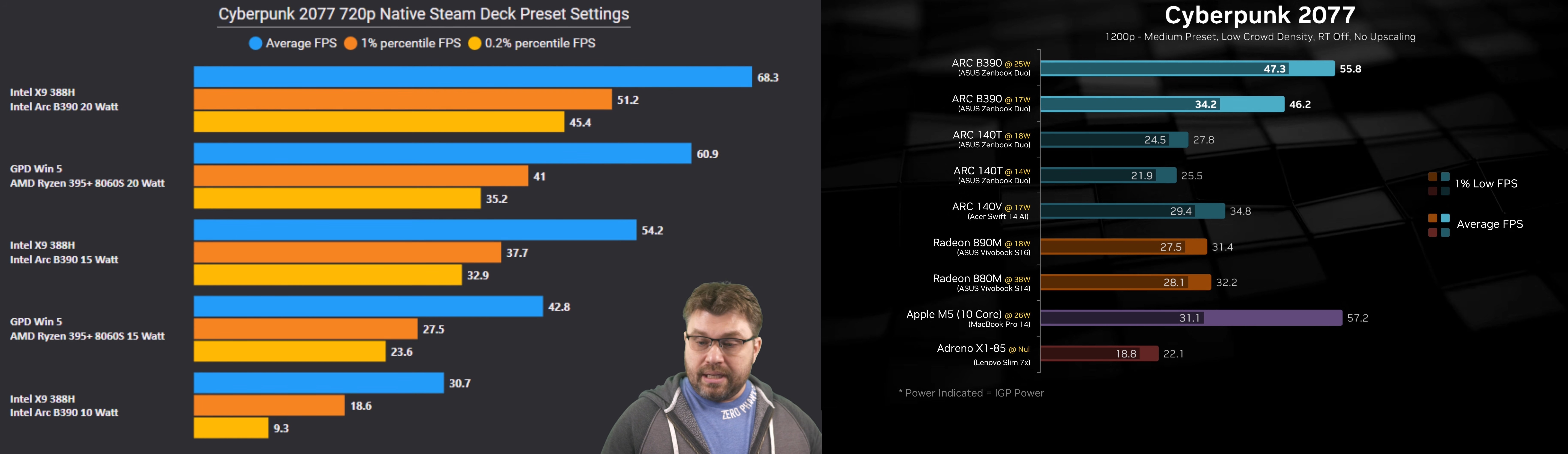 El konsolu odaklı güç limitlerinde yapılan ölçümlerde de benzer bir tablo söz konusu. 10W-35W aralığında gerçekleştirilen testlerde Arc B390, Ryzen AI HX 370 iGPU'yu birçok oyunda geçmeyi başarıyor. Özellikle 20W üzerindeki güç seviyelerinde performans artışının daha belirgin hâle geldiğini söyleyelim. Cyberpunk 2077 gibi zorlayıcı yapımlarda ise orta ayarlarda 50 FPS seviyelerine yaklaşıyor.